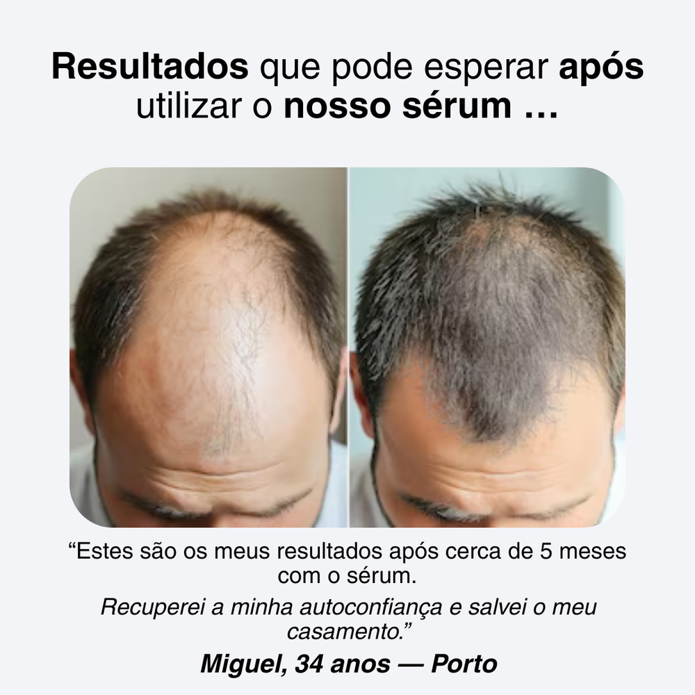 Qualquer pessoa que sofra de cabelo a ficar mais fino, queda capilar ou recuo da linha frontal — independentemente do género. O nosso Sérum foi desenvolvido para homens e mulheres que desejam melhorar a densidade do cabelo, apoiar o crescimento e recuperar a autoconfiança. Seja ao notar os primeiros sinais de queda capilar aos 20 anos ou ao querer fortalecer o cabelo existente mais tarde na vida — esta fórmula funciona universalmente. Independentemente da idade, tipo de cabelo ou estágio da queda: se deseja um cabelo mais cheio e saudável, este sérum é para si.