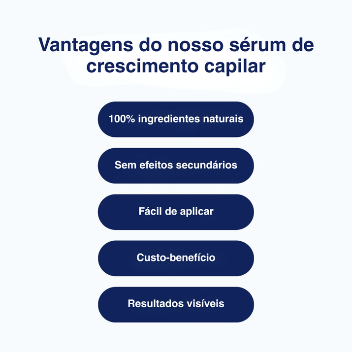 De forma alguma! E isso é uma das coisas que os nossos clientes mais adoram. O nosso Sérum é leve, de absorção rápida e formulado especificamente para não deixar resíduos oleosos, acúmulos ou secura. Ao contrário de muitos produtos capilares que entopem os poros ou deixam o couro cabeludo pesado e desconfortável, o nosso sérum desliza suavemente sobre a pele e é absorvido em segundos. É alimentado por ingredientes clinicamente apoiados que nutrem o couro cabeludo sem perturbar o seu equilíbrio natural, garantindo que o cabelo receba o que precisa e que o couro cabeludo permaneça fresco, respirável e livre de irritações. Perfeito para uso diário. Sem confusão. Sem brilho. Apenas um cabelo mais saudável — desde a raiz.